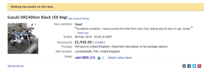 A number of last second bids saw it go for £2938… that’s crazy money for a '58-plate DRZ no matter how good the condition is. The market has really picked up on these, as Suzuki main dealers were selling '58-platers with similar mileage & in excellent condition for that price TWO YEARS AGO! The seller has done alright here… when he bought it new from George Whites in Swindon, I’m certain he’d have paid just under £4k for it. There’s not many mainstream bikes over 125cc that can be bought new and sold over 5 years later having lost only a couple of hundred quid a year in depreciation.