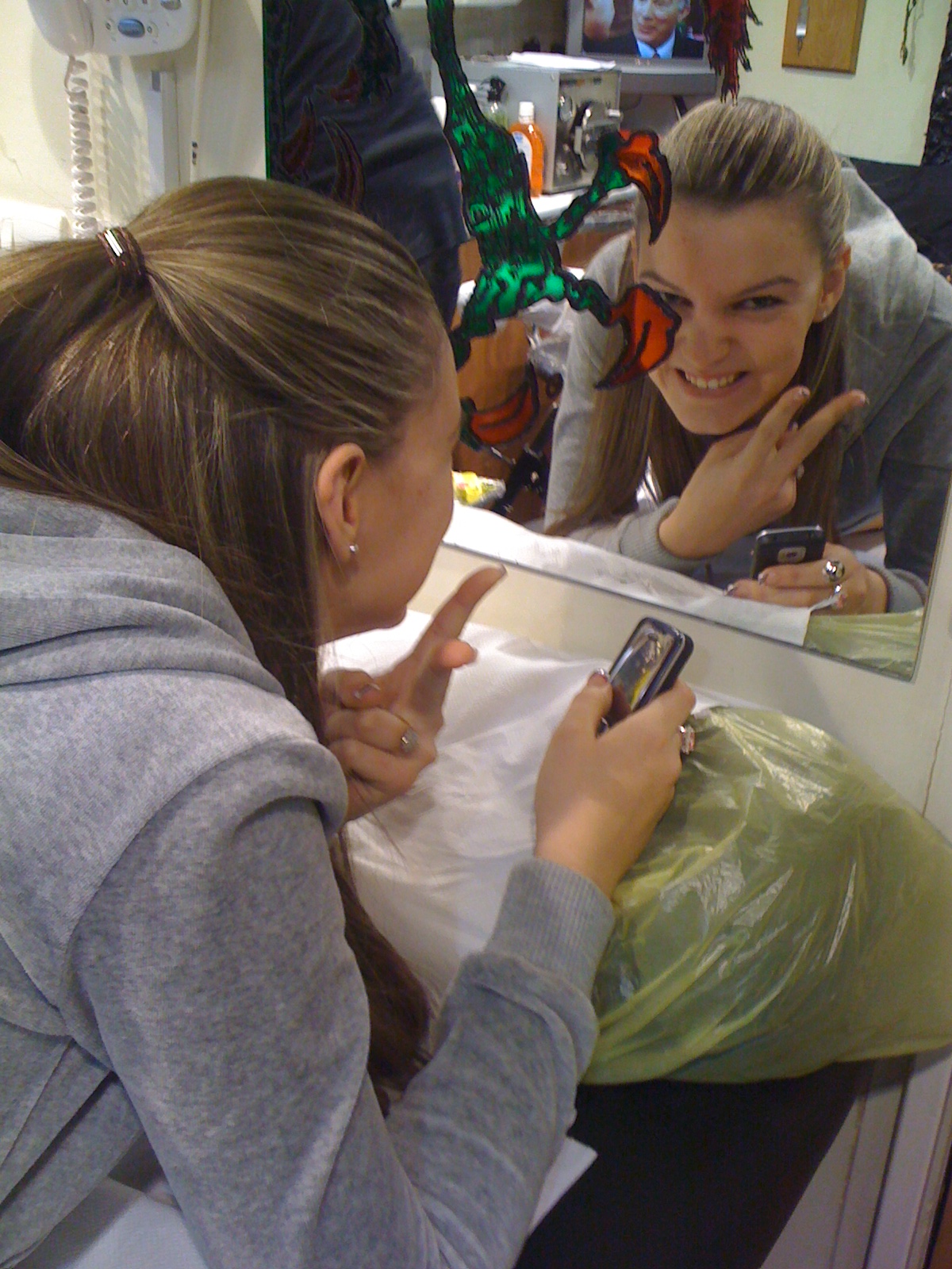 She also has a small scar on her left cheek/ cut at the same angle. Possible due to cat o 9 tails…or arse implants.