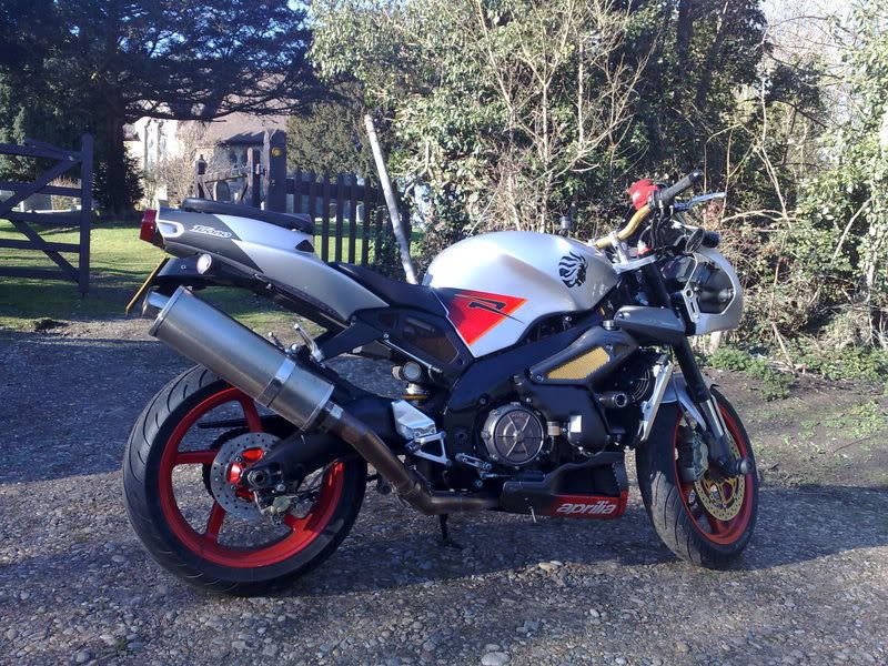 Nice bike fella:). Just a thought not sure if it’s your cup of tea but have you thought about the mirror mod. I know quite a few Tuono owners to do it. Well the ones who don’t like the micky mouse ears mirrors. Replace them with some motrax bar end mirrors, but instead of putting them on the bar ends. Take the bar end bit off of the mirrors, then your left with a clamp, and clamp them round the indicator stalk. The mirrors are convex and you get a much better view and personnely I think it makes the bike look a bit better and meaner, but if your changing your indicators it might not work. Oh and if you carry a pillion you can’t see a thing:w00t: just knees:D You can just see them on mine in the pic.
