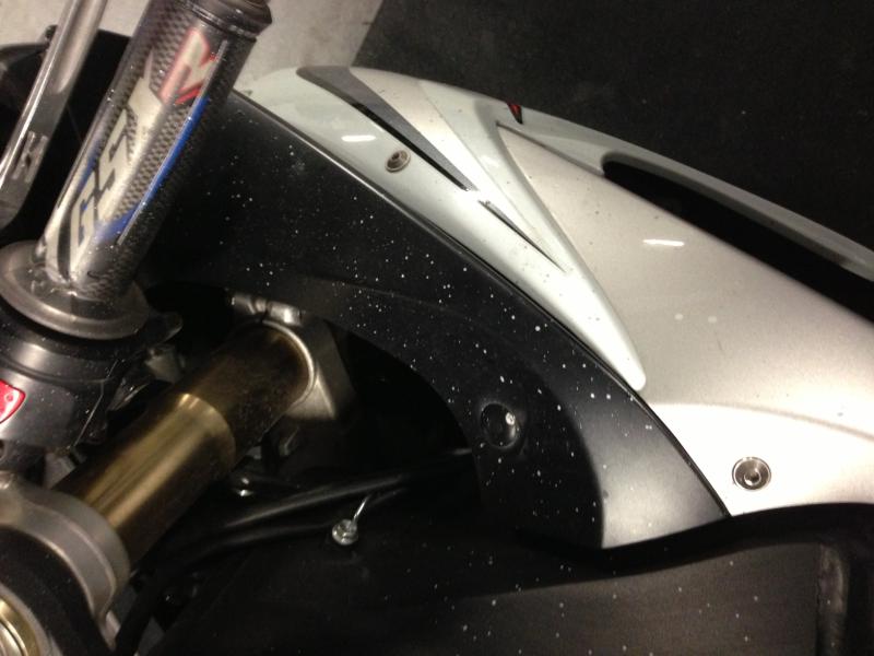 The white spirit doesnt even fade the paint splatters, the only thing that seems to get it off slightly is when I dap the cloth in a bit of petrol and scrub it really hard cleaned about 5 square inches in 40 minutes! I want to know if anyone has any ideas on how to get this off…Its on the fairings, mirrors, headlamp, frame (pretty much every piece on the right hand side).