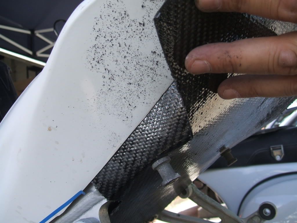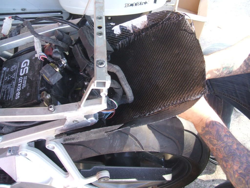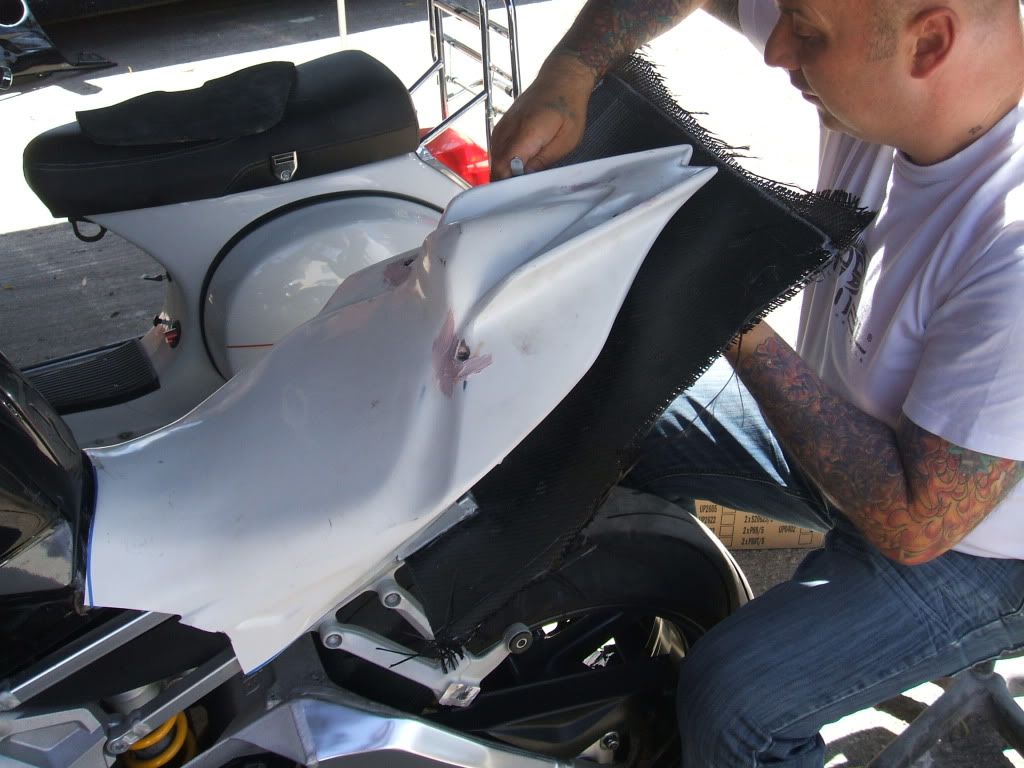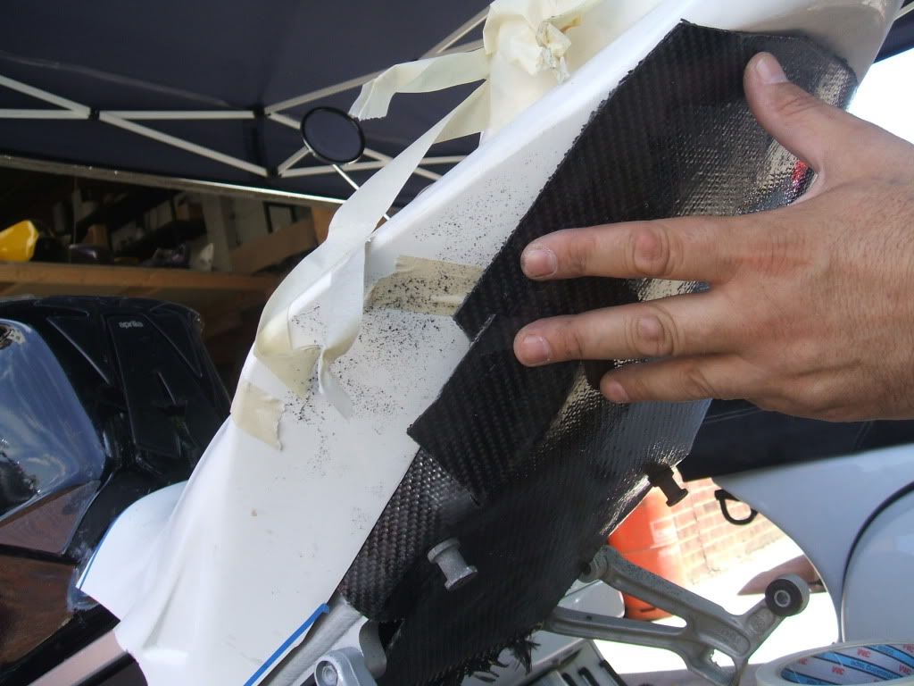 The next thing myself & Iain (the Baldy) done was to warm up the CF with the heat gun, gently & slowly, ensuring that the CF did get to hot. Start shaping the CF around the outside of the seat unit, this will give you a rough shape. We then used making tape to hold the CF in shape, using the heat gun to warm up where cooling has taken place. Allow the CF to cool, I use a panel beaters dolly and gently smooth over. This effectively cools down the CF quicker & becomes ridged.