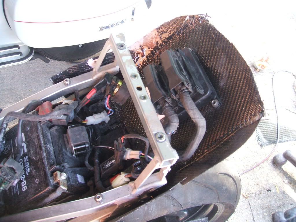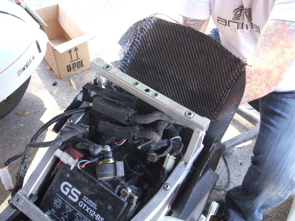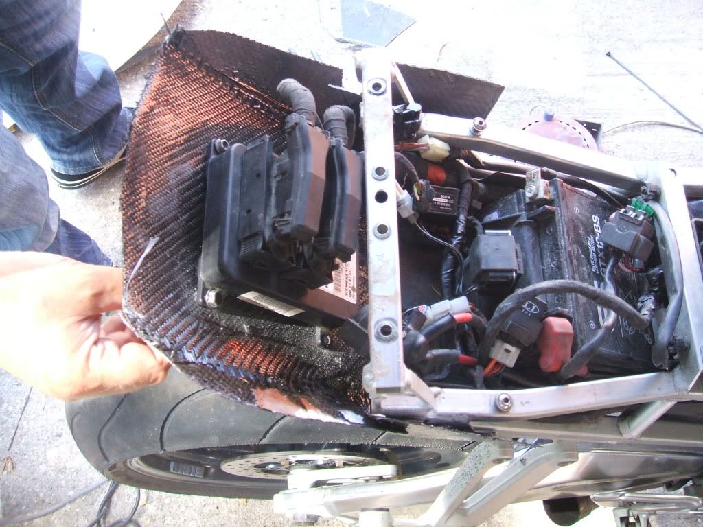 Once we had got the shape right & both seat unit & tray were a good fit. I removed the seat unit & place a square sheet of CF in the tray & applied the resin. This is to strengthen the tray & it it is now possible to mount the ECU.