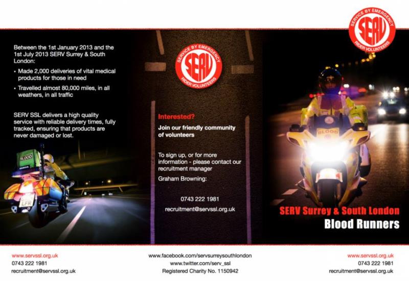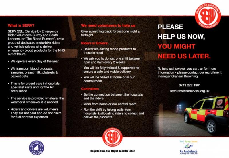 I volunteer for & represent in this thread SERV Surrey & South London (which is a registered charity). SERV SSL is a member of the National Association of Blood Bikes (http://www.bloodbikes.org.uk/). Whilst our catchment area is broadly speaking “South of the River”, we’re a key part of the supply chain to other areas such as Kent, Sussex, Wessex & further afield through our colleagues in other SERV regions.