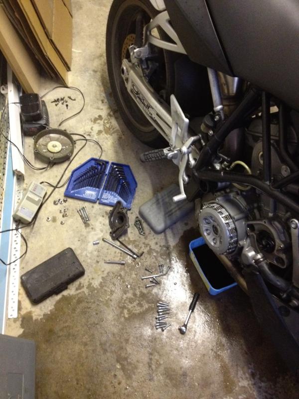 Now to the water pump seal on the Superduke. A known issue. Strip the right hand side of the engine casing. Clutch cover off, oil screen out (catch the oil- must remember that next time), drain coolant, write a list of where the different size bolts go.