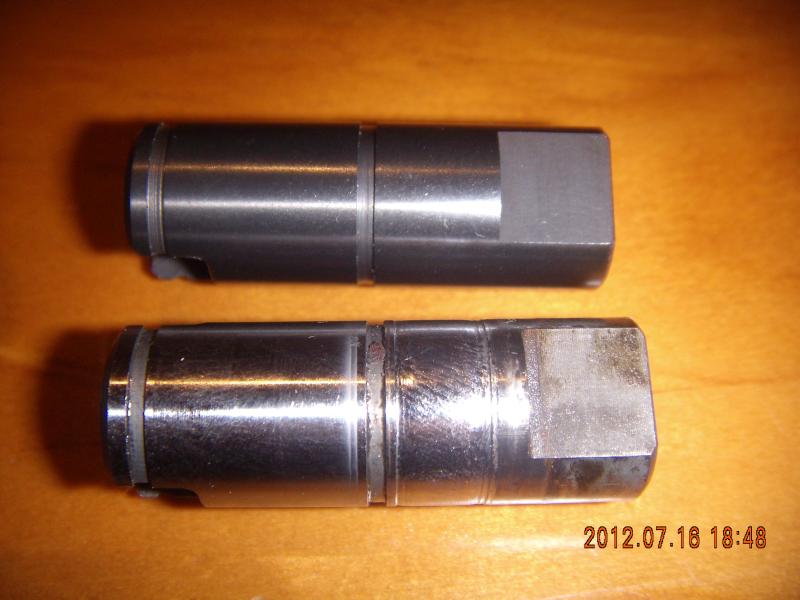 Here are the new (top) and replacement water pump shafts (bottom). You can see where the seal has worn the shaft in two places - there are two rings around it, allowing the leak from the higher pressure water side into the engine side.